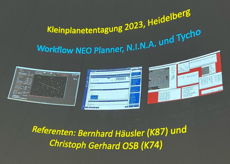 Vom 2. bis 4. Juni 2023 fand ich Haus der Astronomie die Kleinplantentagung der Vereinigung der Sternfreunde statt. Unter den Vortragenden waren Bernhard Häusler (Dettelbach, Vineyard Observatory) und P. Christoph von der Klostersternwarte, die ihren automatisierten Ablauf der Asteroidenbeobachtung vorstellten.