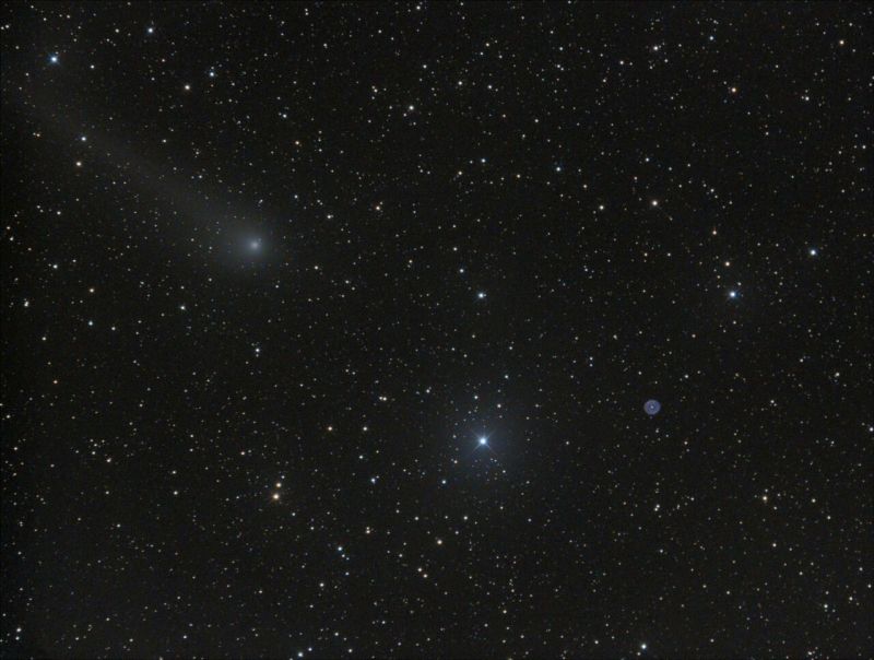 Der Komet Catalina 2013/US10 gewann in den letzten Wochen sehr an Höhe und ist seit einiger Zeit zirkumpolar, das heißt er geht in unseren Breiten nicht unter, sondern ist immer am Nordhimmel zu sehen. Ende Februar wollte ich wieder ein Bild von dem schwächer werdenden Kometen machen, bevor er völlig uninteressant wird. Er wanderte durch das Sternbild Giraffe, das sehr unscheinbar ist. Dabei ging mir der Nebel NGC 1501 mit ins Netz.