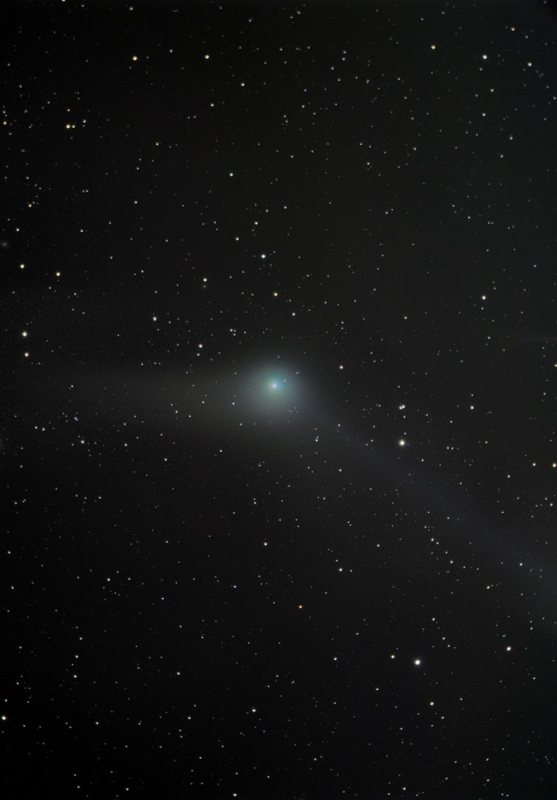 Die Größe des Kometen hat aber mit der geringeren Distanz zu uns erheblich zugenommen. Alleine der Ionenschweif ist etwa ein Grad lang, der Staubschweif ist etwas kürzer. Damit nimmt er eine Breite von dreimal dem Monddurchmesser am Himmel ein. Der Kern mit seiner Koma ist relativ hell und deutlich zu sehen.