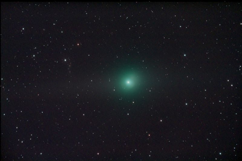 Das Bild ist mit einer digitalen Spiegelreflex Kamera aufgenommen worden. Sie ist leider nicht so empfindlich wie die sonst von mir verwandte gekühlte Kamera. Damit sind die Bilder nicht eins zu eins zu vergleichen. Es gibt aber dennoch das stark veränderte Aussehen des Kometen insgesamt wieder.