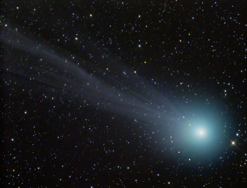 Das Bild zeigt neben einer diffuser werdenden Koma um den Kopf des Kometen noch immer ausgeprägte Linien im Schweif. Sie sind am stärksten von Ionen, das heißt von geladenen Atomen dominiert. Die grüne Koma des Kopfes kommt von Kohlenstoffmolekülen, die durch das Sonnenlicht grün leuchten. Die blaue Farbe des Schweifes kommt von positiv geladenen Kohlenmonoxidmolekülen, die ebenfalls das Sonnenlicht anregt.