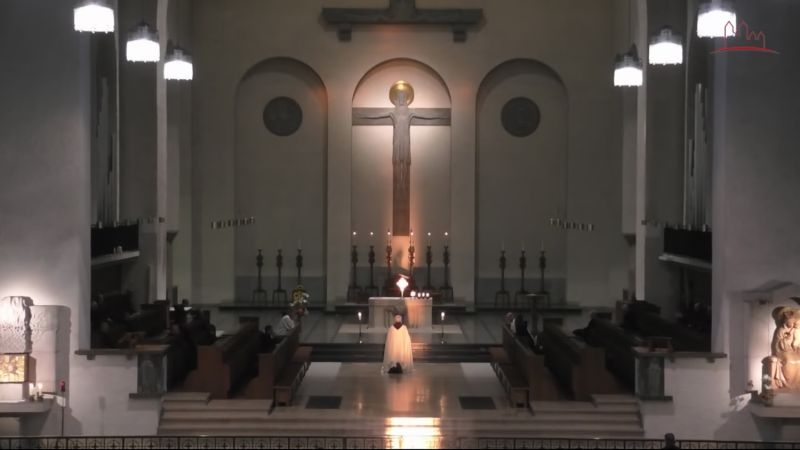 Aufgezeichnet wurde das Bild nur zufällig während des Livestreams aus unserer Abteikirche. Niemand von uns Mönchen ist sonst von uns auf der Empore um gerade zur richtigen Zeit eine Aufnahme von der abendlichen Anbetung zu machen. Aus der Live-Aufnahme wurde eine Bilderserie von etwa 100 Bildern generiert, die mit "astronomischer" Bildverarbeitung in ihrer Auflösung und Darstellung optimiert werden konnten. Das Bild der dunklen Bereiche in der Kirche würde sonst zu sehr mit Rauschen und Qualität hinter den helleren Bereichen zurück bleiben.