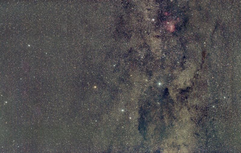 Deutlich sind auf der Aufnahme auch die vielen Dunkelwolken der Milchstraße in diesem Bereich zu erkennen. Der rechte untere Bereich wird nicht zu Unrecht "Kohlensack" genannt, da er fast alles Licht der Hintergrundsterne unserer Galaxie verschluckt. Bei näherem Studium finden sich viele Details, wie Sternhaufen und Wasserstoffwolken. Dazu in einem späteren Beitrag mehr.