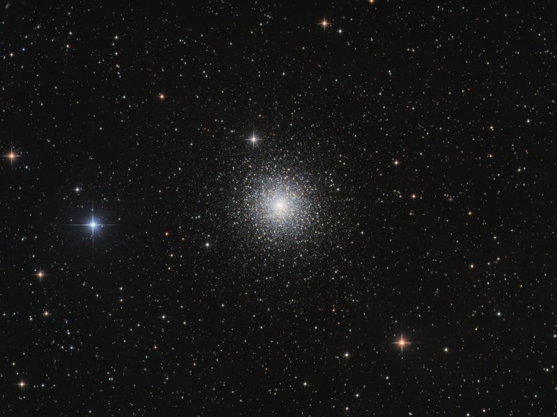 Messier 15 ist hingegen sehr rund und einer der dichtesten Kugelsternhaufen, den die Astronomen kennen. Hundertausende von Sternen stehen dort im Sternbild Pegasus zusammen und bilden einen stellaren Kronleuchter, der schon bei der visuellen Beobachtung seinen Reiz hat. Bei besten Bedingungen ist er schon mit bloßem Auge zu sehen, am besten ist es aber ein Fernglas zur Hand zu nehmen. Er findet sich ausgehend vom rechten unteren Eck des Pegasus-Quadrates, wenn man der Verlängerung des Sternendreiecks nach Westen folgt. In einem mittleren Instrument wirkt Messier 15 schon majestätisch, kann aber im Zentrum nicht aufgelöst werden. In größeren Geräten bleibt das Zentrum wie granuliert und nicht auflösbar. Man kann aber bei höherer Vergrößerung versuchen, den Planetarischen Nebel Pease-1 zu finden.