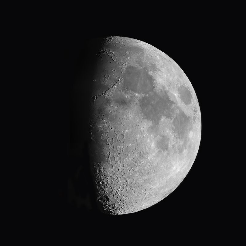 Um die größten Strukturen auf dem Mond zu benennen: Der "Mann im Mond" ist rechts oben zu erkennen. Der Kopf ist das Mare Serenitatis, darunter folgt das Mare Tranquilitatis, darunter das kleine Mare Nectaris und rechts außen Mare Fecunditatis. Oberhalb davon am Mondrand folgt noch das Mare Crisium. Durch die Schattengrenze nur halb sichtbar sind Mare Frigoris ganz oben, darunter das Mare Imbrium und unterhalb der Bildmitte befindet sich das Mare Nubium.