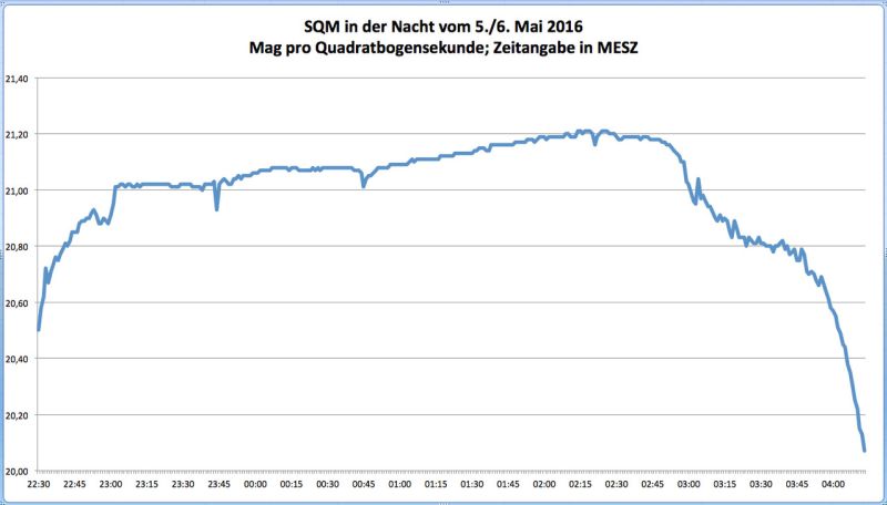Ein weiteres Bild zeigt die Helligkeit des Himmels während einer Nacht, in der ich NGC 4631 belichtet habe. So richtig dunkel wurde es kurz vor Mitternacht bis drei Uhr morgens (MESZ). Der "Spitzenwert" von 21,23 mag pro Quadratbogensekunde bedeutet, dass visuell mit freiem Auge noch Sterne bis zu 6,2 mag zu sehen waren. Für Unterfranken kein schlechter Wert.
