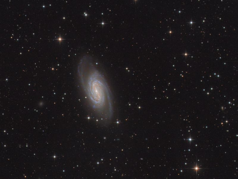 Eindeutig ist auch NGC 2903 von Begegnungen mit anderen Galaxien geprägt, wobei sie allerdings keine größeren Nachbarn hat, und isoliert am Himmel steht. Die kleine bauschige Galaxie links, UGC 5086, hat in etwa die gleiche Distanz zu uns, wie ihre viel größere Nachbarin: 20 Millionen Lichtjahre oder es wird auch 30 Millionen Lichtjahre angegeben. Eine weitere kleine Begleitgalaxie ist allerdings nicht mehr im Bildfeld.