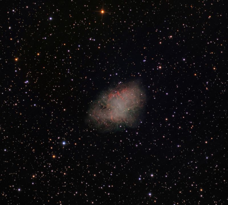 Im Zentrum sind zwei kleine Sterne zu sehen. Der rechte untere Stern ist der Supernovarest, ein Neutronenstern mit einem sehr kleinen Durchmesser von 10 km, der mehrere Sonnenmassen schwer ist! Um ihn zeigen sich die chaotischen Gasreste des früheren Sterns, der 1054 explodierte. Die gewaltige Explosion wurde von chinesischen Astronomen aufgezeichnet und der Stern konnte damals noch am Taghimmel neben der Sonne beobachtet werden!