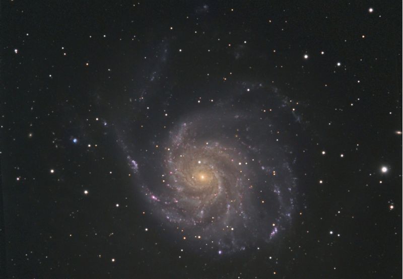 M101 ist etwas doppelt so groß im Durchmesser, wie unsere Milchstraße. Mit etwa 20 Millionen Lichtjahre steht sie uns noch relativ nahe. Dennoch braucht man gute Bedingungen und ein größeres Gerät, um die Spiralarme auch visuell zu sehen. Selbst fotografisch ist sie eine Herausforderung, wenn der Himmel nicht ganz so klar ist.