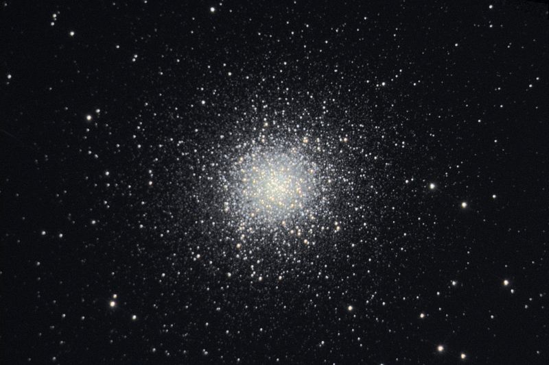 ist in einer klaren Nacht schon mit dem bloßen Auge im Sternbild Herkules zu sehen. In einem Teleskop verwandelt er sich zu einem Kronleuchter mit Tausenden von Sternen. Für mich war er in der vergangenen Woche, am Morgen des 3.8.201, eine guter Standard, um an ihn die Qualität der Abbildung eines Teleskops zu testen. Dabei zeigte sich M13 in sowohl in seiner visuellen als auch in seiner fotografischen Fülle mit fast unzählbaren Sternen, die ganz eng in seiner Kugel versammelt sind.