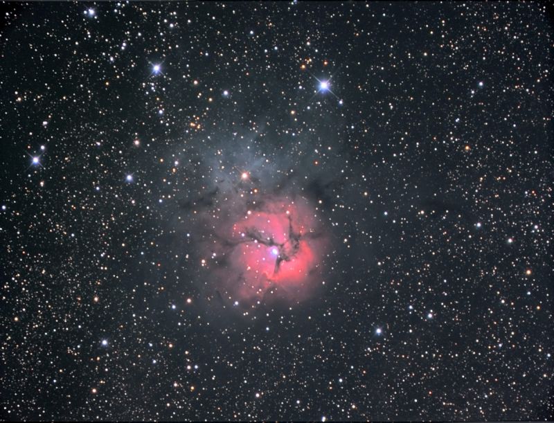 hat auch die Bezeichnung Trifidnebel, da er von drei Dunkelwolken durchzogen ist und als solcher auch wunderschön im Teleskop zu beobachten ist. In der ersten klaren, aber noch kalten Juli-Nacht habe ich den Nebel nach dem Kleinplaneten Pluto zum Ziel meiner CCD-Kamera gemacht. Aber die Zeit vom 15.7. reichte noch bei weitem nicht aus. So musste ich eine Woche warten, bis ich am frühen Morgen des 23.7. weitere Teilbilder aufnehmen konnte und so ein schönes Bild des M20, Trifidnebel erhielt.