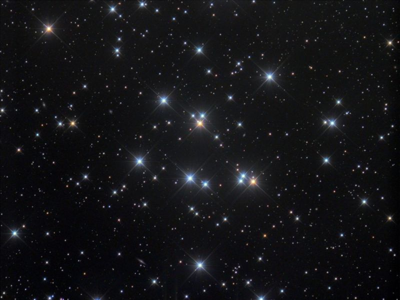 Im Hintergrund von M44 sind einige Galaxien zu erkennen. Dabei sind NGC 2643, 2637 und UGC 4526 (von links mitte oben nach unten im Bild) die auffälligsten. Sie stehen in Millionen-facher Entfernung zu uns wie M44.