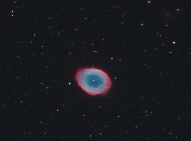 Über den Zentralstern in der Mitte, sind noch verschiedene Einzelsterne im Ring zu sehen. Da die Distzanz von Planetarischen Nebeln generell ein Problem ist, ist die angegebene Distanz von 2300 Lichtjahren.