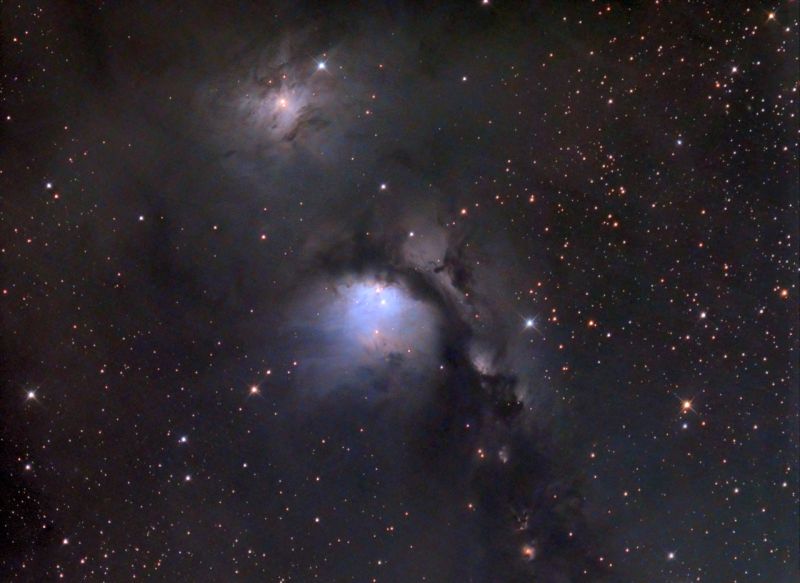 Als Charles Messier im Jahre 1780 nach Pierre Mechain M 78 beobachtete war für ihn sicherlich sein eigenes Kerngebiet im Hintergrund gestanden: die Entdeckung, Beobachtung und Bahnbestimmung von Kometen. M78 macht in einem kleinen Teleskop durchaus den Eindruck eines Kometen, auch wenn sich zwei auffällige Sterne in ihm befinden. Ein schwaches Leuchten um zwei Sterne lassen sich ausmachen. So sah ich ihn auch selbst mit meinen ersten Teleskopen. Mit einem größeren Instrument lässt sich in einer transparenten Nacht aber die ganze Ausdehnung des Nebelkomplexes erahnen. An M78 lässt sich leicht die Durchsicht einer Nacht testen. Oder besser, man nimmt eine Kamera an die Hand und belichtet über einige Stunden bei einer mittleren Brennweite.