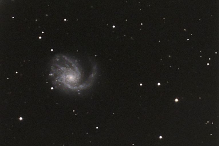 Um einem "hellen" Stern in der Nähe von M99 aus dem Weg zu gehen (HIP 60089, er wäre bei besten Bedingungen mit bloßem Auge zu sehen), habe ich die Galaxie nicht in die Bildmitte setzen können. Die CCD-Kamera neigt bei hellen Objekten zum "Blooming", was man am besten mit "überlaufen" übersetzen könnte. Es kommt dabei zu einem technischen Effekt bei der Sättigung von Pixeln in der Kamera. Wenn der höchst mögliche Wert erreicht wird, dann setzt sich die Belichtung in den benachbarten Pixeln fort. Die Pixel "laufen über" in der Zeile, in der sie sich befinden. Das führt zu unschönen Längsstrichen an den Sternen. Je heller ein Stern überbelichtet ist, desto stärker sind sie.