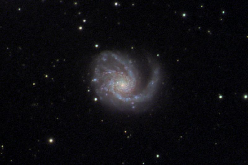 macht einen deutlich unsymmetrischen Eindruck beim Betrachten im Telelskop. Fotografisch kommt sehr deutlich heraus, wie unterschiedlich die Spiralarme der Galaxie sind. M99 steht im Sternbild der Coma Berenices und gehört zum großen Virgo-Galaxienhaufen.Dabei dominiert der süd-westliche (rechte) große Spiralarm die Galaxie und ist deutlich größer und ausgedehnter als die beiden oder gar drei anderen, kleineren Spiralarme in Richtung Osten. M99 hat eine deutlich blaue Farbe, die von großen jungen Sternhaufen in den Armen hervorgerufen wird. Einzelne rot leuchtende große Wasserstoffwolken, aus denen eben solche Sternhaufen entstehen werden, sind in ihnen eingebettet. Die Entfernung liegt bei etwa 45 Millionen Lichjahren.