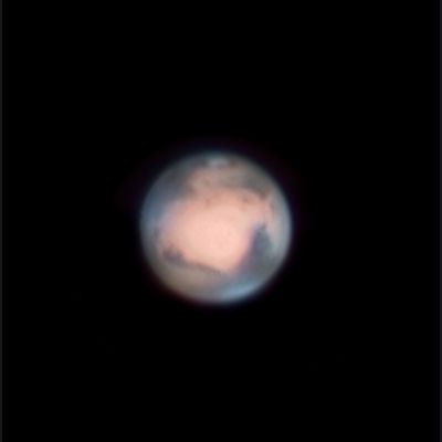 Mit etwas Glück und Luftruhe lassen sich aber zahlreiche Details auf dem Planetenscheibchen ausmachen. Zudem kamen in den letzten Wochen mehr und mehr blaue Kohlendioxidwolken auf dem Mars ins Spiel, die dem roten Planeten einen eigenen Reiz verleihen. Ein Beobachter meinte sogar: "der hat ja jetzt vier Polkappen!" So viele sind es allerndings nicht.
