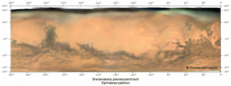 Am Äquator liegt der hellere Bereich der Arabia Terra, gefolgt von der großen, dunklen Struktur der Syrtis Mayor. Unterhalb der großen Syrte befindet sich das Hellas Becken. Anschließend nach Westen befindet sich die Terra Thyrrena. In der Mitte ab 180° liegt das dunkle Feld der Daedalia Planum. Darüber findet sich der größte Berg des Sonnensystems überhaupt: Mons Olymp. Gleich westlich darunter sind die großen erloschenen Vulkane der Tharsis Montes. Das Valles Marineris leitet zu Chryse Planitia und Noachis Terra über. Hoch im Norden findet sich die Acidalia Planitia.