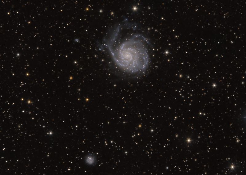Im Sternbild Großer Bär(in) steht diese wunderbare Spirale aus Sternen und Licht. Einige von den riesigen Sternhaufen und leuchtenden Gaswolken haben eigene Katalog-Nummern im New Great Catalogue erhalten. Zwei dieser Begleitgalaxien sind im Bild zu finden links von M101 und unterhalb: NGC 5474, NGC 5477. Beide zeigen deutliche Spuren einer Begegnung mit M101, wie es auch die verbogenen Galaxienarme der Feuerradgalaxie andeuten.