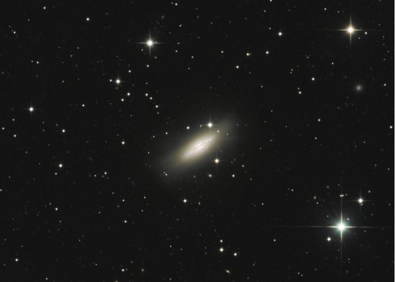 In jedem Fall ist Messier 102 der Prototyp einer linsenförmigen Galaxie, die in ihrer Mitte ein deutliches Staubband zeigt. Deshalb wird sie auch gerne als "Spindel"-Galaxie bezeichnet, was in der insgesamt über vier Stunden belichteten Aufnahme recht gut zu sehen ist. Weiter rechts, gen Westen im Bild, ist die Galaxie NGC 5866A zu finden. Eine kleine, elliptische Galaxie, die im gleichen Abstand zu uns steht, wie M102 und damit wohl auch direkt mit ihr verbunden ist in einer Entfernung von etwa 40 Millionen Lichtjahren. Damit ergibt sich ihr Durchmesser zu etwa 60.000 Lichtjahren, etwas weniger als die Hälfte des Durchmessers unserer Milchstraße.