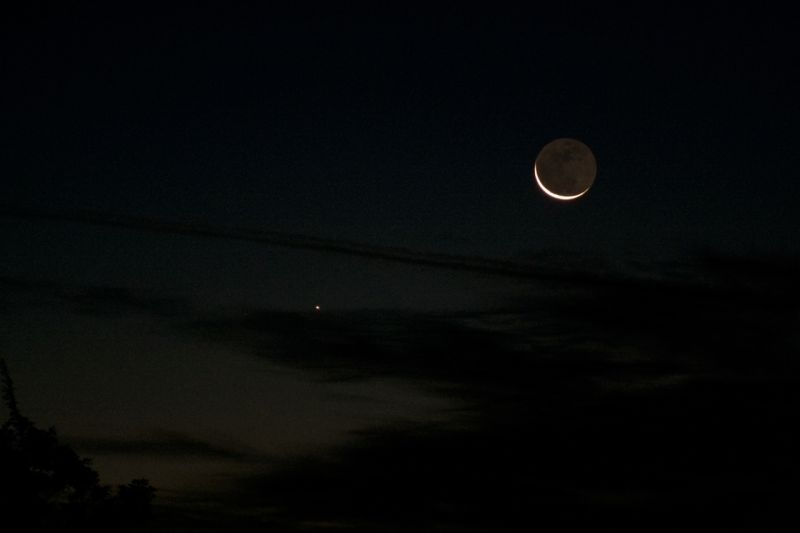 Nach dem Morgengebet habe ich mich auf einen Balkon begeben, um von einer höheren Warte aus tief an den Osthimmel blicken zu können. Immer wieder konnte ich schon die Mondsichel zwischen den Wolken sehen, aber mit Merkur tat ich mich schwerer. Aber gegen 6:12 MESZ war auch der kleine Planet neben dem Mond deutlich durch die Wolken zu erkennen.