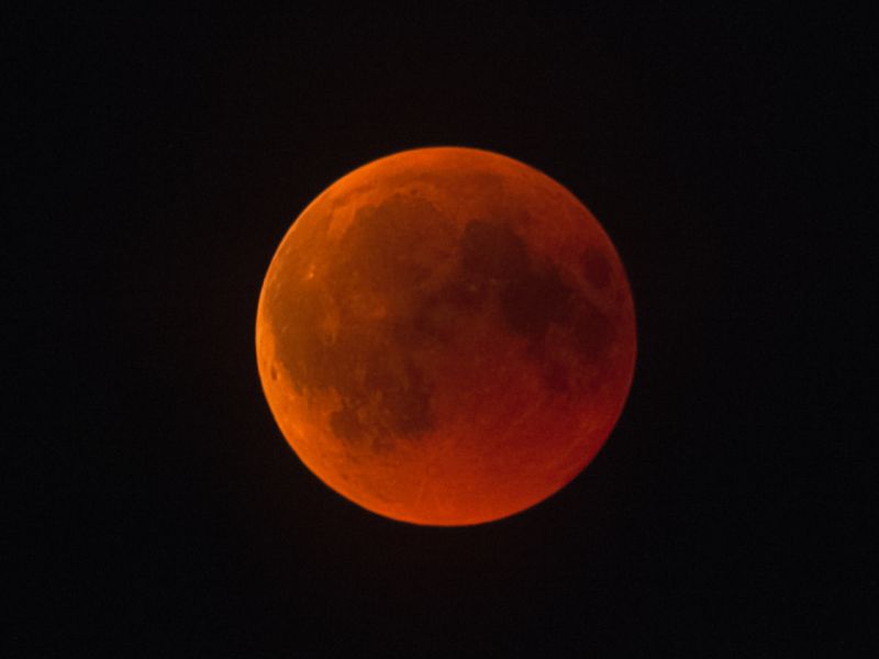 Dabei erschien der Mond zunächst unscheinbar blass-rötlich am noch blauen abendlichen Himmel. Er war schon völlig in rot getaucht - höchstens an dem nach Nordwesten zeigenden Rand war noch eine leichte Aufhellung zu sehen. Sie verschwand im Laufe der Zeit und der ganze Mond war gleichmäßig verfinstert: Zeichen dafür, dass sich der Mond durch den zentralen Bereich des Erdschattens bewegte.
