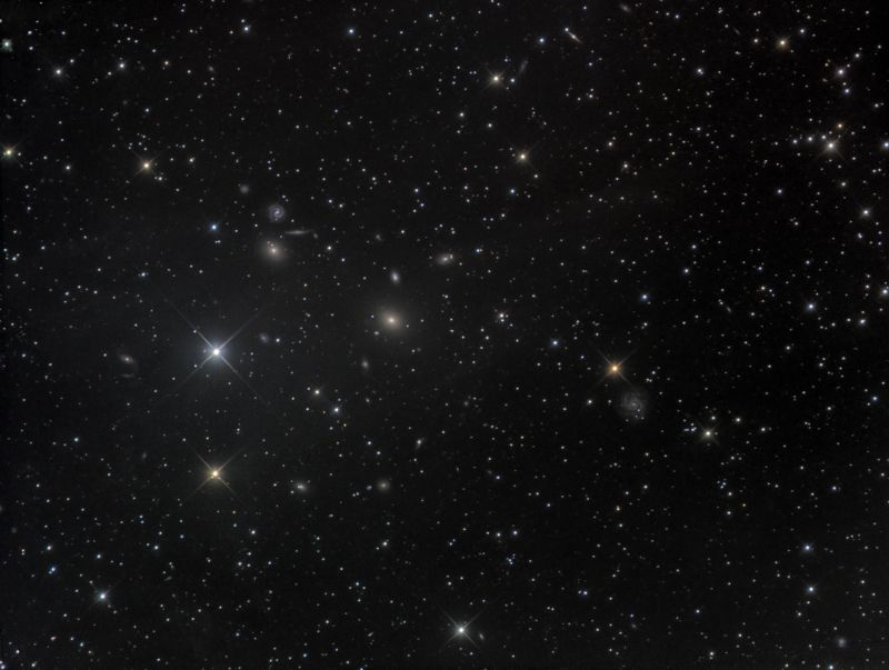 NGC 1060 ist eine große elliptische Galaxie, die mir ihrer Schwerkraft eine ganze Gruppe von Galaxien an sich bindet und deren Bewegung im intergalaktischen Raum bestimmt. Die helleren von ihnen sind NGC 1061 direkt über ihr, NGC 1057 rechts oberhalb und links oben sind es NGC 1066, 1067 und PGC 10331. Eine Fülle von kleineren Galaxien sind in der Umgebung von NGC 1060 noch zu finden. Die auffälligste unter ihnen ist PGC 10227 mit ihrer Spiralgestalt weiter rechts zwischen zwei helleren Sternen.