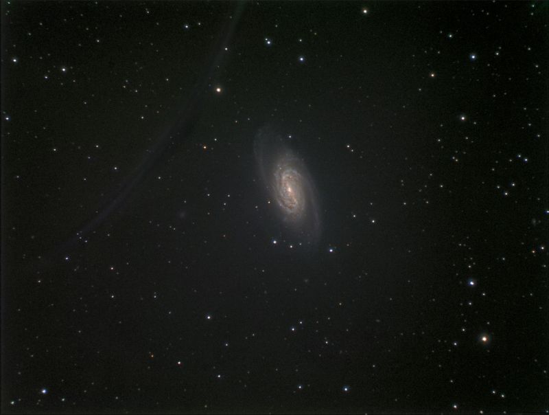 NGC 2903 steht im Kopf des Löwen. Sie ist schon mit einem Feldstecher zu sehen. Eigentlich wäre sie von ihrer Helligkeit her im Bereich der Teleskope von Charles Messier gewesen, aber sie ist ihm bei der Verfolgung seiner zahlreichen Kometen wohl nie ins Blickfeld geraten. Wilhelm Herschel hat sie 1784 entdeckt. Mit einer Entfernung von etwa 20 Millionen Lichtjahren steht das Sternsystem uns relativ nahe und ist mit 70.000 Lichtjahren Durchmesser keine "große" Galaxie. Im Bild ist neben dem zentralen Balken und seine Verdichtungen, die amorphe Struktur von NGC 2903 auffällig, die durch große Sternhaufen und Staubwolken gebildet wird. Ihre östliche Seite dürfte uns zugewandt sein. Weit ausladend sind zwei schwache Ausläufer ihrer Sprialstruktur im Norden und Süden.