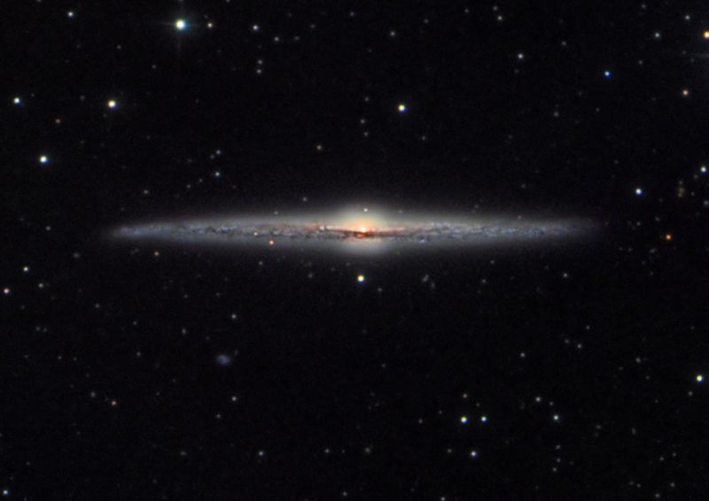 Die Struktur der Dunkelwolken wird auch länger belichteten Aufnahmen in ihrer ganzen Differnziertheit offenbar. Und noch etwas fällt bei der fotografischen Abbildung auf: die Galaxie hat eine leicht verbogene Ebene: die Enden gehen beiderseits in verschiedene Richtungen nach oben. Eine Ursache dafür ist im Bild leicht auszumachen (siehe Feldaufnahme): es ist die kleinere Galaxien NGC 4562 rechts von NGC 4565. Eine Welteninsel, die selbst wesentlich stärker gestört ist in ihrem Aussehen und die zu Recht als Zwerggalaxie bezeichnet werden kann.