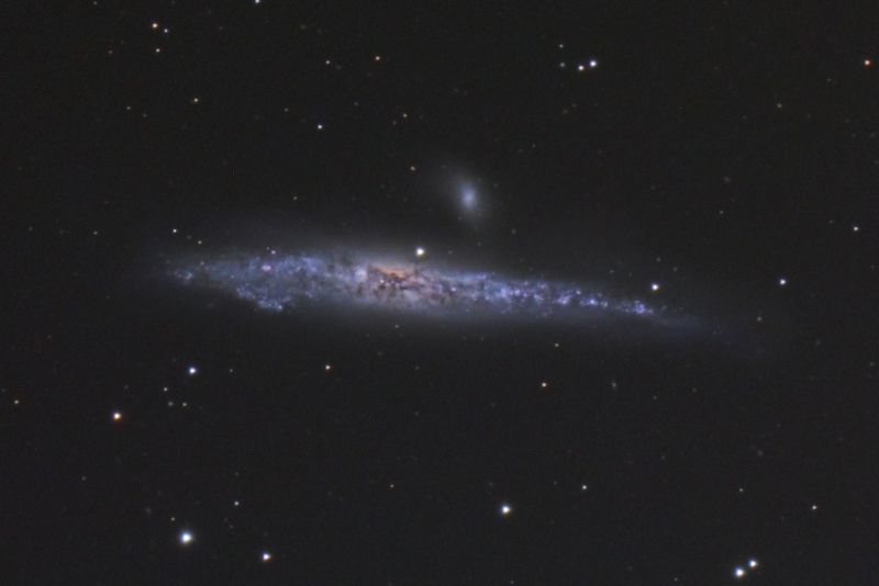 Im größeren Feld meiner Farkamera zeigen sich neben NGC 4631 und 4627 noch eine dritte hellere Galaxie: NGC 4656. Sie ist die dritte Galaxie im Bunde, die mit den beiden in gravitativer Wechselwirkung zu stehen scheint.