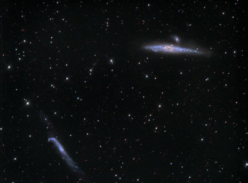 Die Walgalaxie ist in etwa so groß wie unsere eigenen Galaxie oder auch M108: etwa 100.000 Lichtjahre im Durchmesser. Wir sehen eine große Sprialgalaxie von der Seite mit einer ihrer kleineren Satellitengalaxie. Bei genauerem Hinsehen erkennt man die Spuren einer Begegnung von NGC 4631 und NGC 4627. Die kleinere Galaxie ist deutlich in einen leicht länglichen Bogen gezogen, in der großen Galaxie ist eine Delle im Körper zu erkennen.
