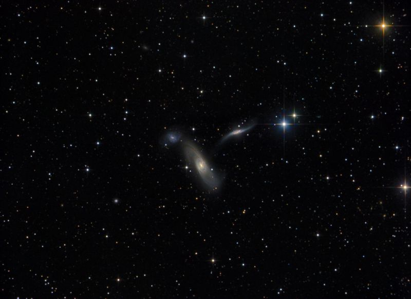 NGC 5566 bildet mit NGC 5560 und NGC 5569 eine sehr schöne Galaxiengruppe, die auch mit Arp 286 bezeichnet wird. Dabei zeigen sich die gravitativen Wechselwirkungen in den drei Galaxien auf sehr unterschiedliche Weise: die kleinste Galaxie durchläuft gerade einen sogenannten Starburst mit vielen blauen Sternen. Das heißt, in ihr haben sich durch die enge Begegnung mit ihrer Nachbargalaxie viele neue Sterne gebildet, die man an ihrer blauen Farbe erkennen kann. In der großen Galaxie NGC 5566 sind die Spiralarme lang gedehnt worden aufgrund dieser Begegnung. Und auch die Ebene der rechten Galaxie NGC 5560 ist sichtlich verbogen.