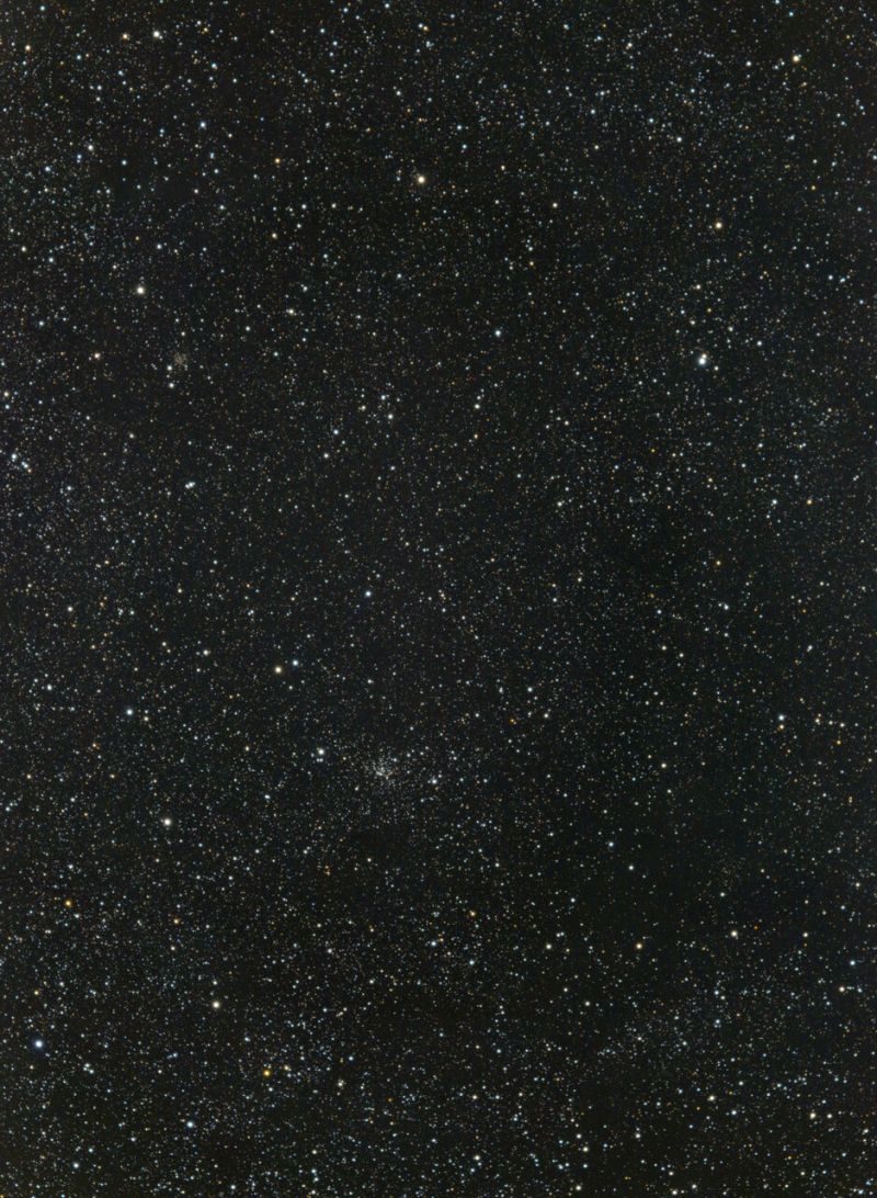 Das Wechselspiel von Sternen der Milchstraße, dem Offenen Sternhaufen selbst und dem kontrastreichen Dunkelnebel geben dem Bild einen eigenen Reiz. Sehr schön ist dies auch auf dem Bild mit großem Gesichtsfeld zu sehen, das mit einer wesentlich kürzeren Brennweite gemacht worden ist. Mit einem drittel der Brennweite ist so an einem kleineren Refraktor auch ein etwa zehnfach größeres Feld erzielt worden.
