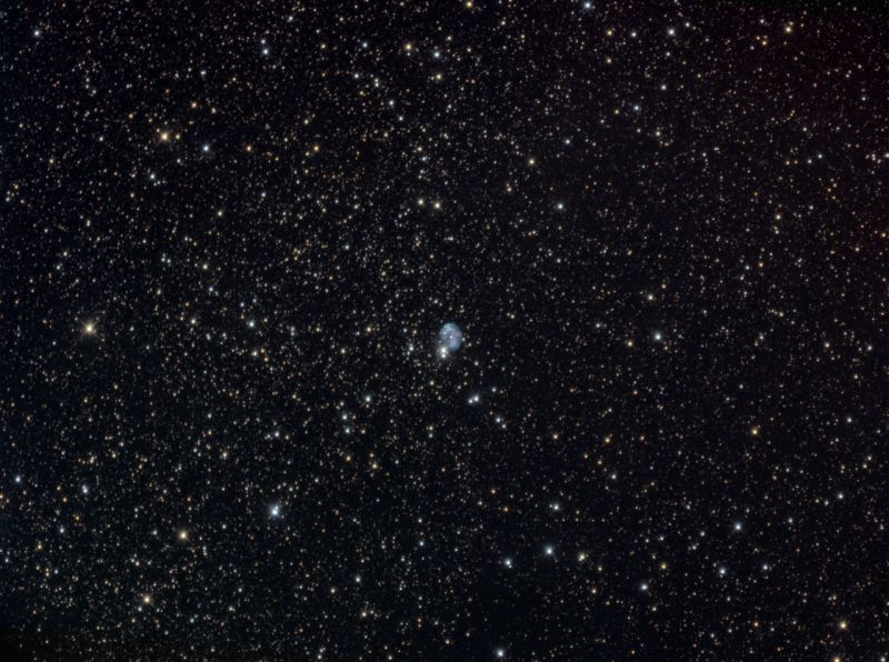 Der helle Stern in der Mitte des Nebels ist ein sogenannter Weißer Zwerg. Ähnlich groß wie die Erde ist ihm dicht gepackt etwa 1/3 bis die Hälfte der ehemaligen Sternmaterie versammelt. Ein wahrhaftiges Schwergewicht! Aber nicht nur die Masse ist dort, auch die übrige Hitze des alten Sternes: Weiße Zwerge sind sehr heiße Objekte, die im Ultravioletten viel Strahlung abgeben und so das um sie liegende Gas zum Leuchten anregen. Fertig ist der Planetarische Nebel!