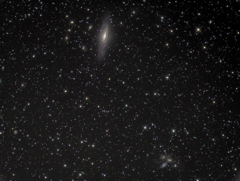 Unten, in der Mitte rechts, ist das sogenannte Stephan´s Quintett zu finden, dessen Namensgeber der französische Astronom Stephan war. Allerdings ist sie nur ein gravitativ gebundenes Quartett, die bläuliche Galaxie links unten in der Gruppe steht weit im Vordergrund und ist nur 40 Millionen Lichtjahre entfernt, während dessen die vier anderen Welteninseln zusammen in einer Entfernung von 300 Millionen Lichtjahren stehen.