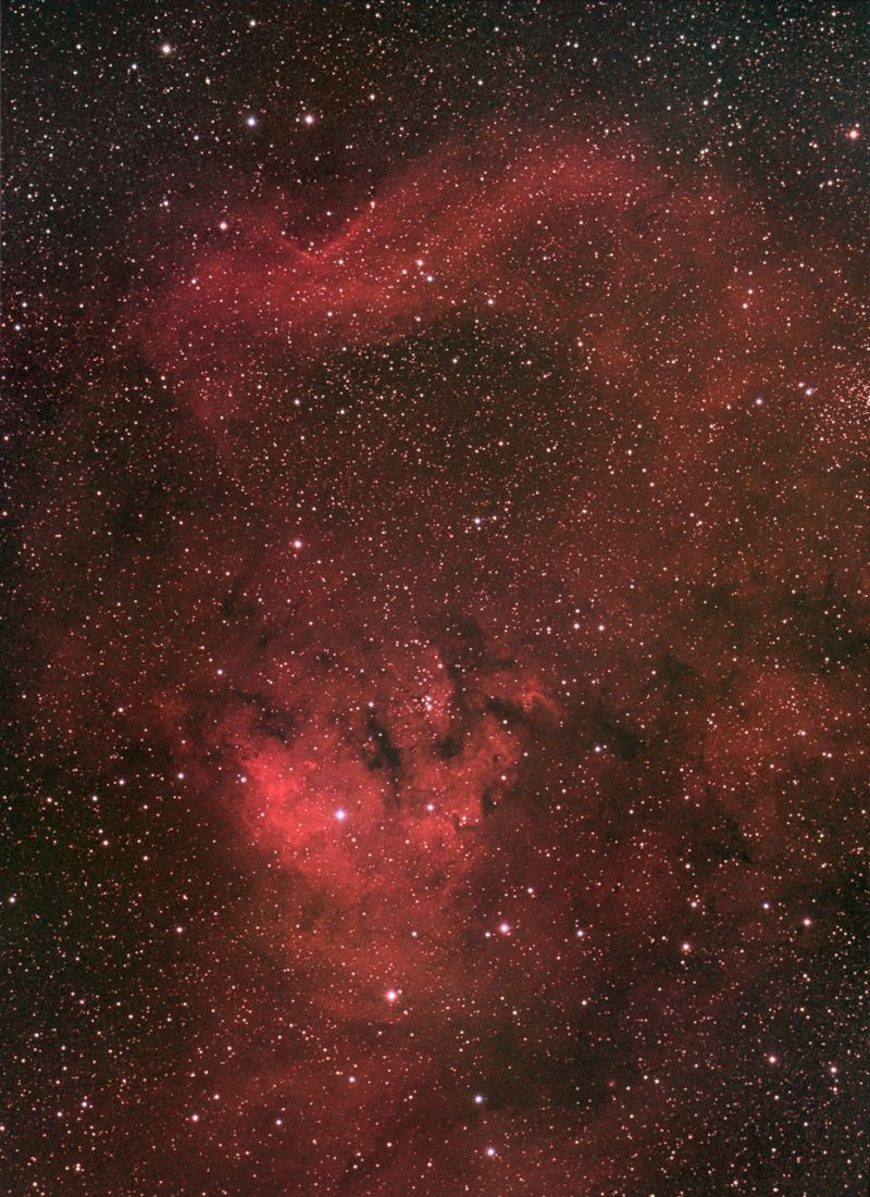 Der obere Teil von NGC 7822, der im Computer der FS2-Steuerung eingebaut ist, zeigt eine wunderschöne Welle aus Gas und Staub. Der südliche und hellere Teil, ist von Gas, Staub und kleineren Sternhaufen durchzogen. Der größte offene Sternhaufen ist ganz rechts außen, oberhalb der Bildmitte zu finden. Da die Ausdehnung des gesamten Nebelkomplexes relativ groß ist, kam kein Teleskop sondern ein Teleobjektiv zum Einsatz.