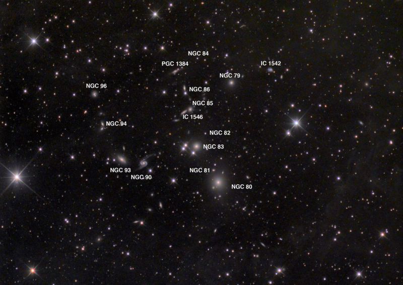 Links von der Bildmitte ist eine geschwungene Spirale, NGC90 oder auch Arp 65. Halton Arp sammelte "eigenartige" Galaxien bzw. Galaxienpaare in einem eigenen Atlas und nummerierte sie durch. Sie hat einen gewaltigen Durchmesser mit 225.000 Lichtjahren. Sie bildet mit ihrem linken Nachbarn NGC 93 ein hübsches Galaxienpaar.