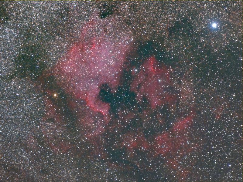 Im Sternbild Schwan ist eines der bekanntesten Wasserstoffnebel zu sehen: der Nordamerika- mit dem Pelikannebel. Es handelt sich dabei um eine riesige, rot leuchtende Gaswolke, die durchzogen ist von Staub und Gas, die wir nicht sehen können. So bekommt die gesamte Wolke für uns (!) ihr charakteristisches Aussehen.
