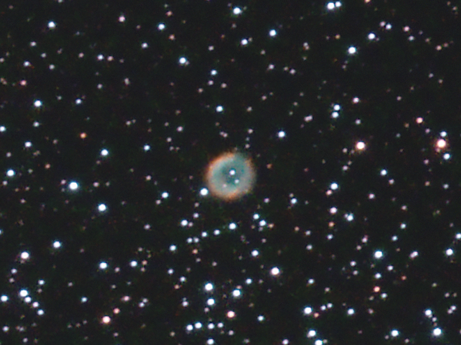 Der Planetarische Nebel NGC 2438 ist als kleines rot-grünes Nebelscheibchen gut vor dem Sternhaufen zu sehen. Sein Zentralstern ist nicht der helle Stern im Nebel, sondern links unterhalb das schwache Sternlein, das gerade noch im Bild zu sehen ist.