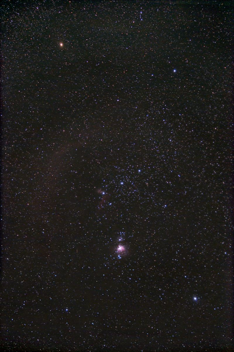 Die schwachen roten Nebel, die im Bild zu sehen sind, bleiben dem freien Auge unsichtbar. Es sind der Flammennebel links und die Wasserstoffregion unterhalb des linken Gürtelsterns, die den Vordergrund für den berühmten Pferdekopfnebel bilden. Der schwache rötliche Bogen links von den Gürtelsternen ("Barnards Loop") ist im Grunde nur auf Fotografien sichtbar zu machen. Dafür kann man den Orionnebel schon an einem dunklen Ort mit freiem Auge erkennen.