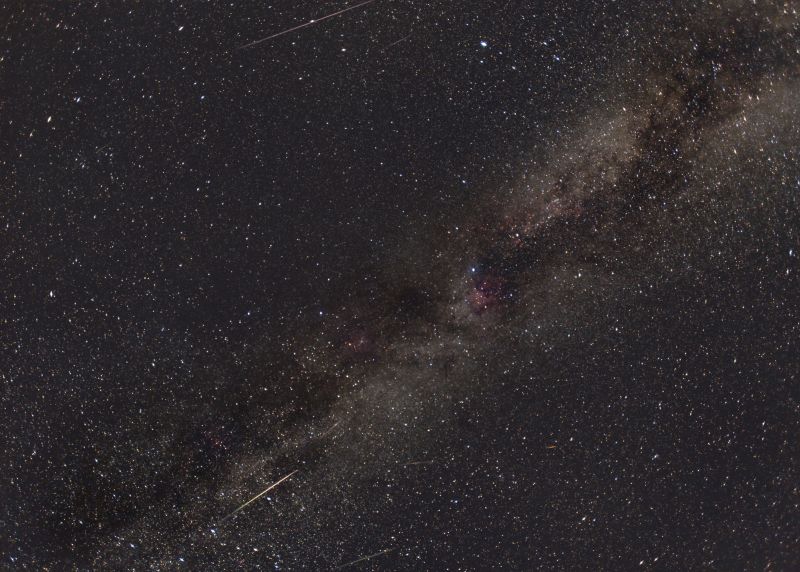 Im Bild sind nun alle belichteten Bilder als Summe verarbeitet. Dadurch gewinnt das Bild an Tiefe und ist weit weniger verrauscht als ein einzelnes Bild. In dieses Summenbild wurden die Meteorspuren aus den Einzelaufnahmen zusammen kopiert und ergeben ein Gesamtbild aller Sichtungen in der knapp einstündigen Gesamtbelichtungszeit.