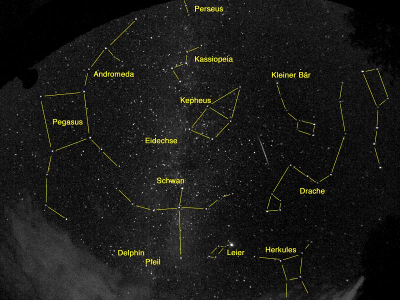 Im Bild ist eines der eingefangenen "Prachtexemplare" einer Perseide. Im Dreieck der Sternbilder Kepheus, Kleiner Bär und Drache huschte sie von Norden nach Süden. Verlängert man ihre Bahn, so findet man in den Perseus, der dadurch der Namensgeber dieses Sternschnuppenstroms wurde.