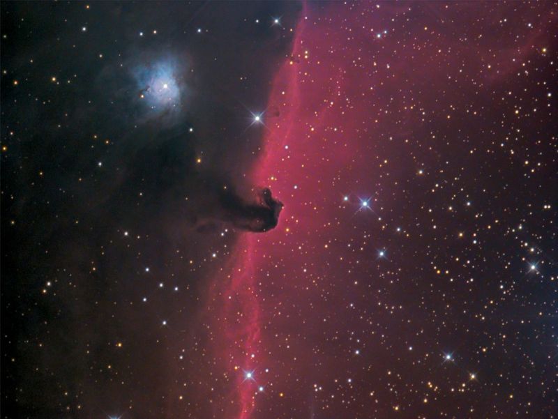 Die Bilder habe ich aktualisiert. Die Aufnahme des Pferdekopfnebels selbst konnte ich noch eindeutig verbessern. Zu der Serie mit dem Flammennebel und dem Pferdekopfnebel fand ich in meinem Bilderarchiv eine Aufnahme von 2011, genau auf den Tag genau fünf Jahre zuvor entstanden. Aus der Kombination beider Abende konnte ich nun eine wesentlich verbesserte Version der Himmelsgegend erstellen.