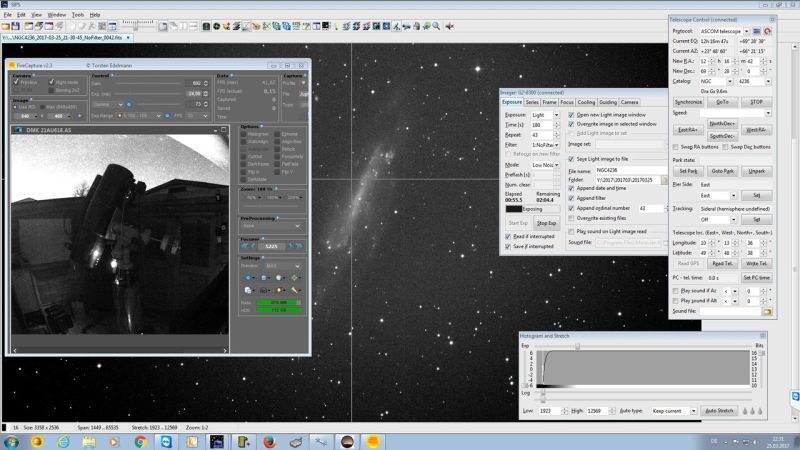 Dabei entstanden zwei wunderbare Aufnahmen von NGC 4236 und dem Kometen Johnson C/2015 V2 über das Internet, das diese Vorgehensweise möglich machte. Über das weltweite Netz konnte ich auf den Computer und damit auf alle relevanten Funktionen - durch ein starkes Passwort geschützt - zugreifen und die Rohbilder machen. Die Vor-Verarbeitung der Bilder geschah auf einem Computer in Münsterschwarzach und die Endbearbeitung dann wieder auf dem lokalen Computer in den USA.