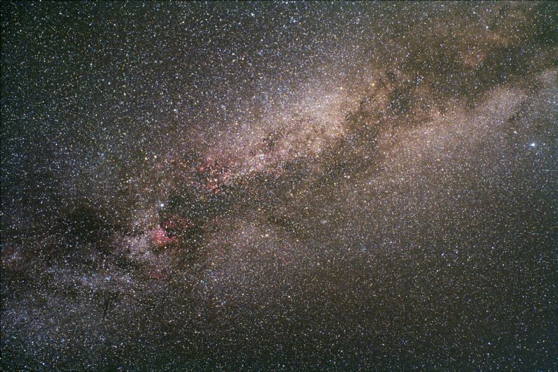 Weiter nach oben im Adler flacht die Helligkeit der Milchstraße zunächst ein wenig ab, um dann wieder im Sternbild des Pfelies zuzunehmen (zweites Bild, rechts oben!). Gerade im Zenit, im Sternbild Schwan können sich die differenzierten Wolken am ehesten zeigen, da dort am wenigsten Luft und Streulicht die Beobachtung stört. Das "fliegende" Kreuz des weist die Richtung weiter nach Norden über seinem Hauptstern Deneb hinweg.