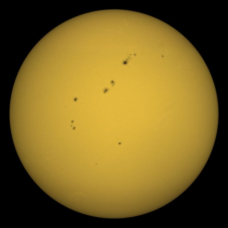 Auf dem Bild befinden sich sieben Fleckengruppen, von denen drei größer sind. Einige Flecken sind sehr ausgeprägt und könnten in den nächsten Tagen auf der Erde Polarlichter auslösen (allerdings werden wir kaum etwas davon zu sehen bekommen, da es endlich regnen soll in den Nächten der nächsten Woche). Daneben sind viele einzelne, kleinere Flecken zu finden.