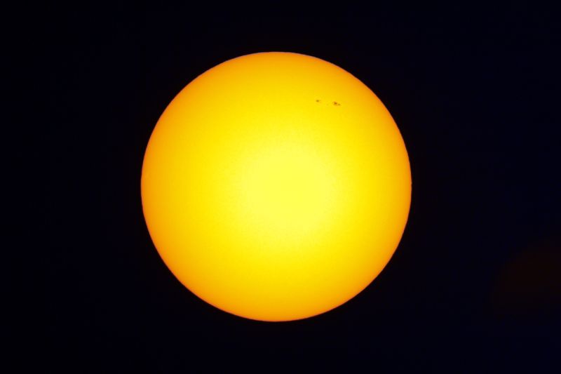 waren diese Woche wieder zu sehen. Die Sonne scheint das Minimum ihres elfjährigen Fleckenzyklus durchschritten zu haben und zeigt ab und an wieder dunkle Stellen mit lokalen Magnetfeldern. Dabei ist der derzeitige niedrige Stand der Sonne (sie kommt maximal 16° über den Horizont) sehr ungünstig. Die Luftunruhe macht es unmöglich eine einigermaßen ungestörte Sonnenoberfläche zu beobachten. Im zweiten Bild des vergrößerten Ausschnitts sieht man den welligen Sonnenrand, der natürlich nichts mit der Wirklichkeit der Sonne, sondern viel mehr mit den Turbulenzen in unserer irdischen Atmosphäre zu tun hat.