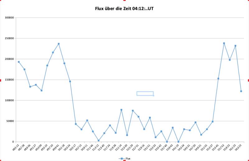 Dann wurde es spannend: um 5:12:00 MEZ wurde die Kamera eingeschaltet. In die Aufnahme wurde ein sogenannter Zeitstempel eigeblendet, auf dem auf die 1/1000 Sekunde die Zeit angezeigt wurde. Um 4:12:50.52 verschwand der Stern und um 4:12:50,55 erschien er wieder. Dazwischen war (fast) nichts zu sehen. Das bedeutet, dass der Asteroid 10% größer sein muss, als angenommen: 80 km ± 3 km. Der Helligkeitsverlauf ergab das obige Diagramm. Dabei ist der gemessene Helligkeitsfluss (Flux) der Kamera über die Zeit dargestellt. Deutlich ist das Vorüberziehen des Asteroiden vor dem Stern zu erkennen.