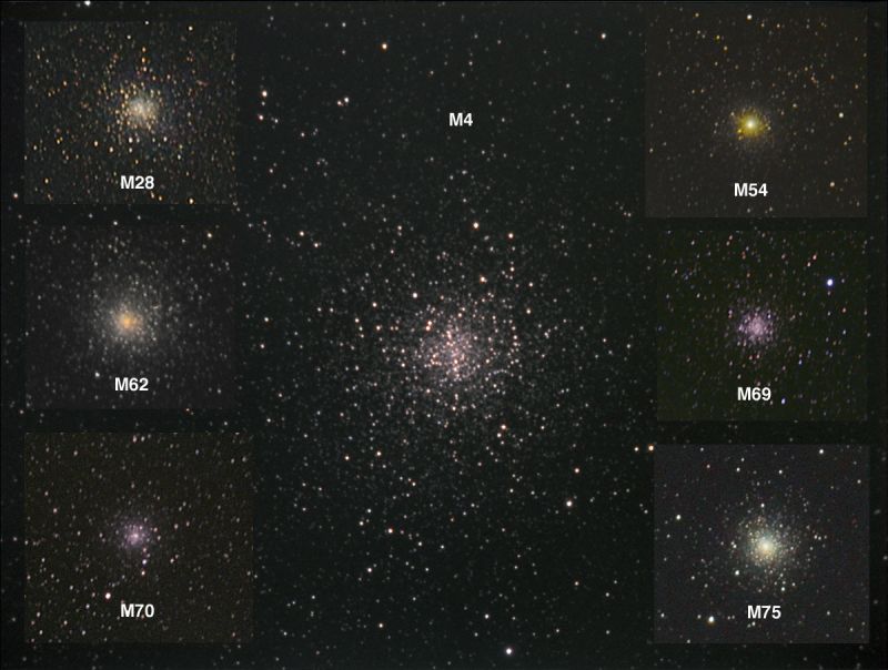 Neben dem nur scheinbar großen M4 (seine Entfernung beträgt "nur" 7.000 Lichtjahre), der mit seiner auffälligen Mittellinie und zahlreichen hellen Sternen auch visuell leicht zu studieren ist, standen die zahlreichen kleinen und wenig beachteten Kugelhaufen M28, M62, M69, M70 und M75 im Mittelpunkt. M54 bildet insofern eine Ausnahme, dass er extragalaktisch in unserer benachbarten Zwergalaxie Sagittarius I steht und mit fast 90.000 Lichtjahren das weitest entfernteste Einzelobjekt des Messierkatalogs ist, das sich in einer anderen Galaxie befindet. Nur am Rande ist er in Einzelsternen mit Mühe aufzulösen.