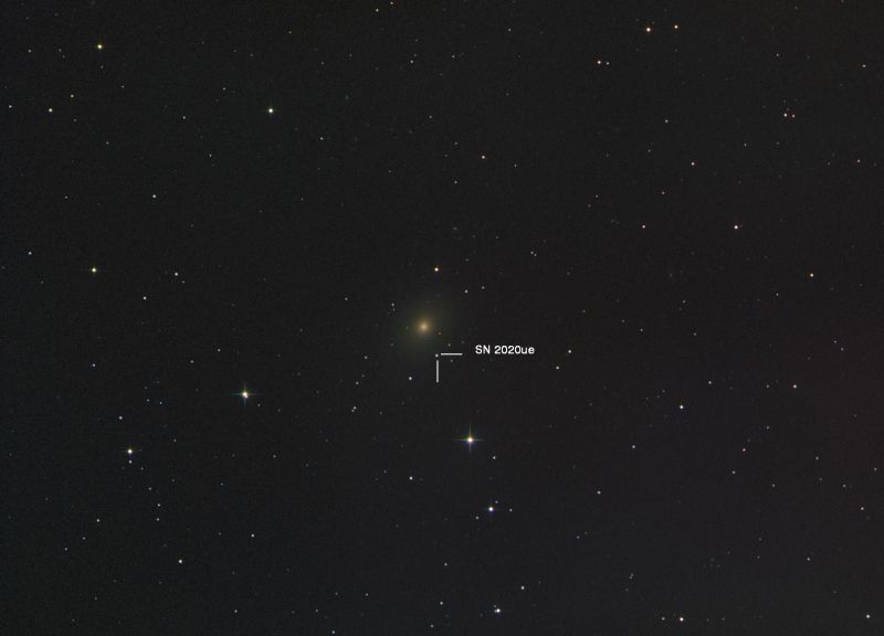 Anfang Februar hatte ich erstmals Gelegenheit den explodierten bzw. explodierenden Stern zu beobachten. Dabei hatte er eine Helligkeit von 12,6 mag. Dafür braucht es ein Teleskop von etwas mehr als 10 cm Durchmesser. Da sich die Supernova (genaue Bezeichnung ist SN 2020ue) weit vom Zentrum der Galaxie NGC 4636 befindet, lässt sie sich leicht identifizieren.